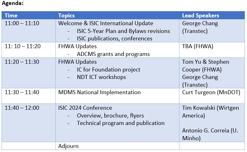 The next ISIC-FHWA Meeting at TRB 2024 will be held on Tuesday, January 9, 2024, in Room 155 of the Washington Convention Center from 11 AM to 12 PM (US Eastern Standard Time). Please click this registration link to save a seat and indicate whether you’ll be in-person or remote. The following is the draft agenda.