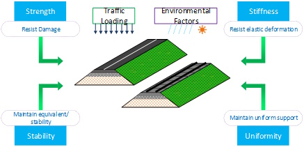From the perspective of transportation infrastructure, an embankment structure primarily functions to withstand the repetitive effects of traffic loads and environmental factors (such as water and temperature). Based on these functional requirements, four key indicators can be utilized to characterize an embankment’s performance: strength, stiffness, stability, and uniformity. These four indicators can be broadly categorized into two aspects of “resistance” and two aspects of “maintenance,” as illustrated in Figure 1.