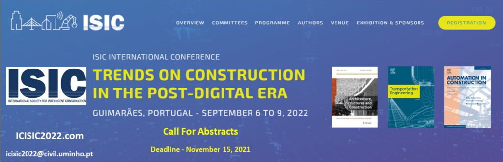 The International Society for Intelligent Construction 2022 Conference (ISIC 2022) will be held in Guimarães, Portugal, from September 6 to 9, 2022. The conference theme is “Trends on Construction in the Post-Digital Era. “ The city of Guimarães, Portugal, is also a UNESCO World Heritage site.