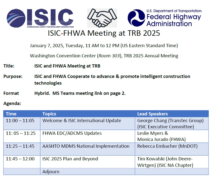 ISIC will have an annual meeting with FHWA at TRB 2025. The following is the agenda.