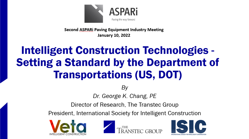 The ISIC’s president, Dr. George K. Chang of Transtec Group, will present at the Second ASPARi Paving Equipment Industry Meeting organized by ASPARi Equipment Manufacturers Commission (Asphalt Paving Research and innovation) at the Universiteit Twente (UT), Nederland. The presentation title is “Intelligent Construction Technologies – Setting a Standard by the Department of Transportations (US, DOT)”. The time will be on Thursday, February 10, from 8:30 AM- 10:30 AM Central European Standard Time.