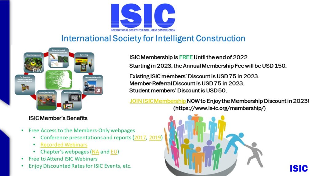 The International Society for Intelligent Construction (ISIC) membership is free until the end of 2022. Starting in 2023, the Annual Membership Fee will be USD 150. Existing ISIC members’ Discount is USD 75 in 2023. Member-Referral Discount is USD 75 in 2023. Student members’ Discount is USD 50 until graduation.